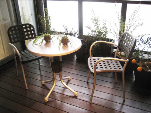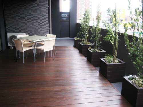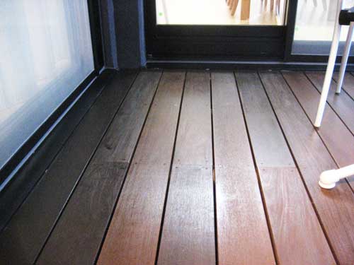 らい。とても広いバルコニーです。デッキの縁にイペ