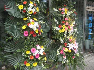 ソウルの世界遺産やお花屋さんの前に飾られていたおもしろい花輪?の写真です。この花輪はよ