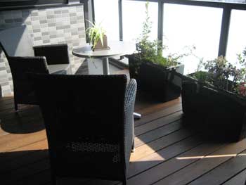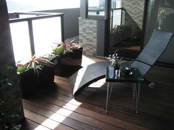 最上階14Fのバルコニー工事をおこないました。ウッドデッキの上に光沢ある長尺プランター(レチ
