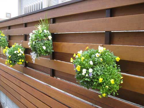 完成したフェンスにはハンンギングバスケットをたくさん掛ける