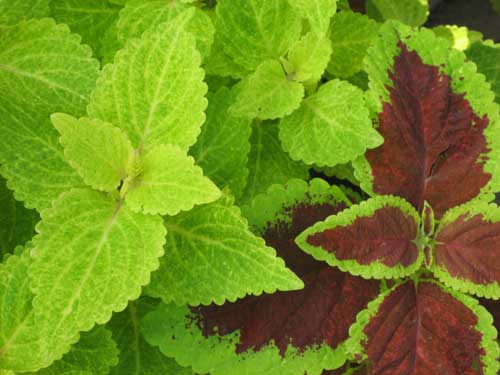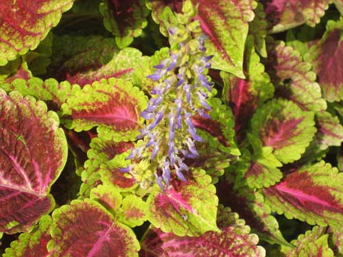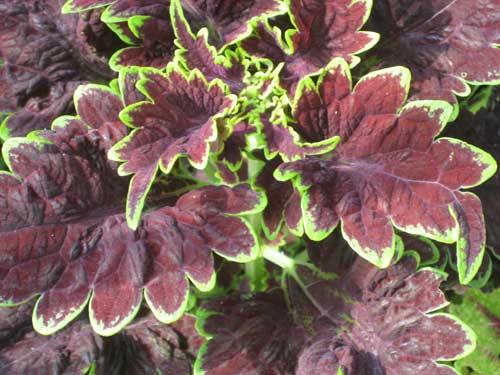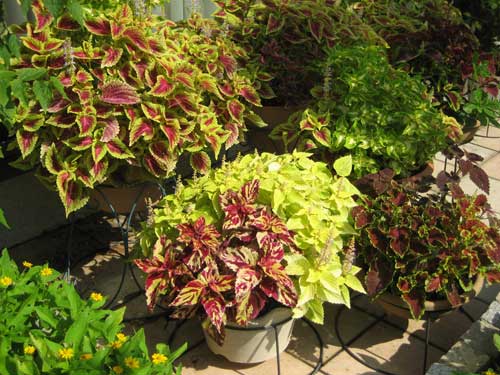 「コリウス」の寄せ植えが今年も元気いっぱい多様な美しい葉を茂らせています。シソ科の