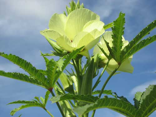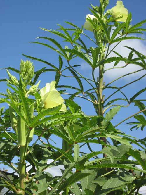 れています。オクラは5つに中〜深裂した形状の葉のつけ根にハイ