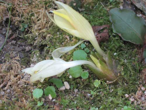 淡いうす黄色の透き通ったとても繊細な花です。夏が近づくと地面から花芽がひょっこり顔